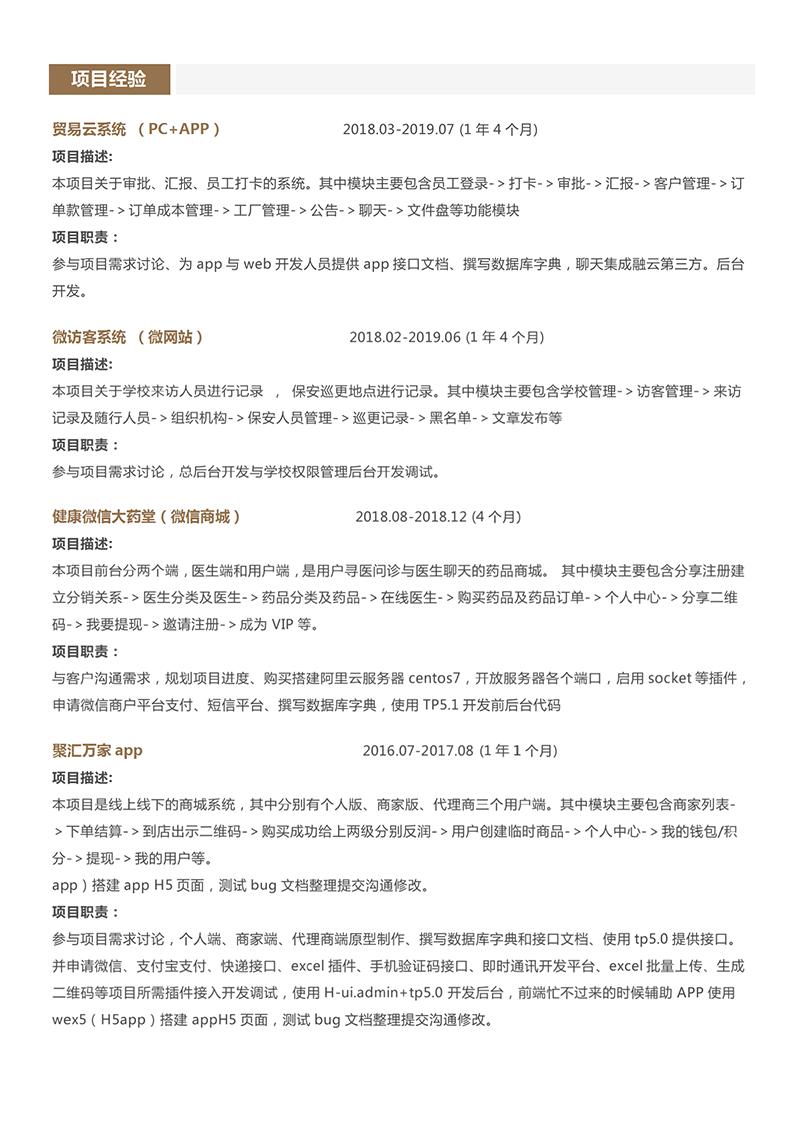 参与项目需求讨论,个人端、商家端、代理商端原型制作、撰写数据库字典和接口文档、使用tp5.0提供接口。并申请微信、支付宝支付、快递接口、excel插件、手机验证码接口、即时通讯开发平台、excel批量上传、生成二维码等项目所需插件接入开发调试,使用H-ui.admin+tp5.0开发后台,前端忙不过来的时候辅助APP使用wex5(H5app)搭建appH5页面,测试bug文档整理提交沟通修改。